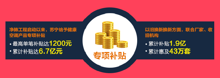“康健空调补助”、“空调以旧换新补助”是净肺工程关于下流消耗端的两项主要行动。净肺工程启动以来,苏宁针对康健空调产物、新风等康健品类专项补助,最高单笔补助达1200元,累计补助达6.7亿元,共惠及约100万套;以旧换新方面,团结品牌及收旧机构,累计补助1.9亿元,共惠及43万套。合计补助8.6亿。
