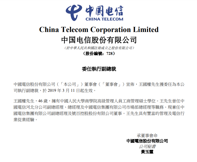 中国电信发布公告,王国权获委任为本公司实行副总裁,于2019年3月11日起见效。