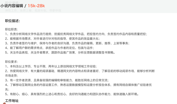 除此以外,往年1月,字节跳动也曾在拉勾上放出“小说内容编纂”和“小说运营司理”等职位。