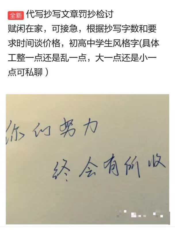“比拟网上代写功课的机构,我代写的功课内容更切近实际。”在李同砚看来,这也许就是门生代写功课的上风地点——削减功课被家长、先生看破的可以也许,“若是字体都是连笔,学问点老是超纲,那末被看破是代写的概率很大。”