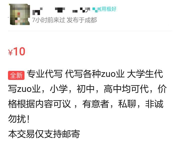 这位13岁的重庆女孩儿,经由过程二手电商平台宣布代写寒假功课的信息,一个月下来收入近万元。终究,因为誊写太工致被“买家”的黉舍先生看破,同时账号也遭到了告发。
