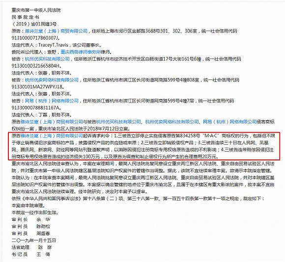 近日,中国裁判文书网公开了雅诗兰黛告状杭州优买科技有限公司、杭州优卖收集科技有限公司和网易(杭州)收集有限公司关于侵占“M·A·C”商标权一案的民事裁定书。