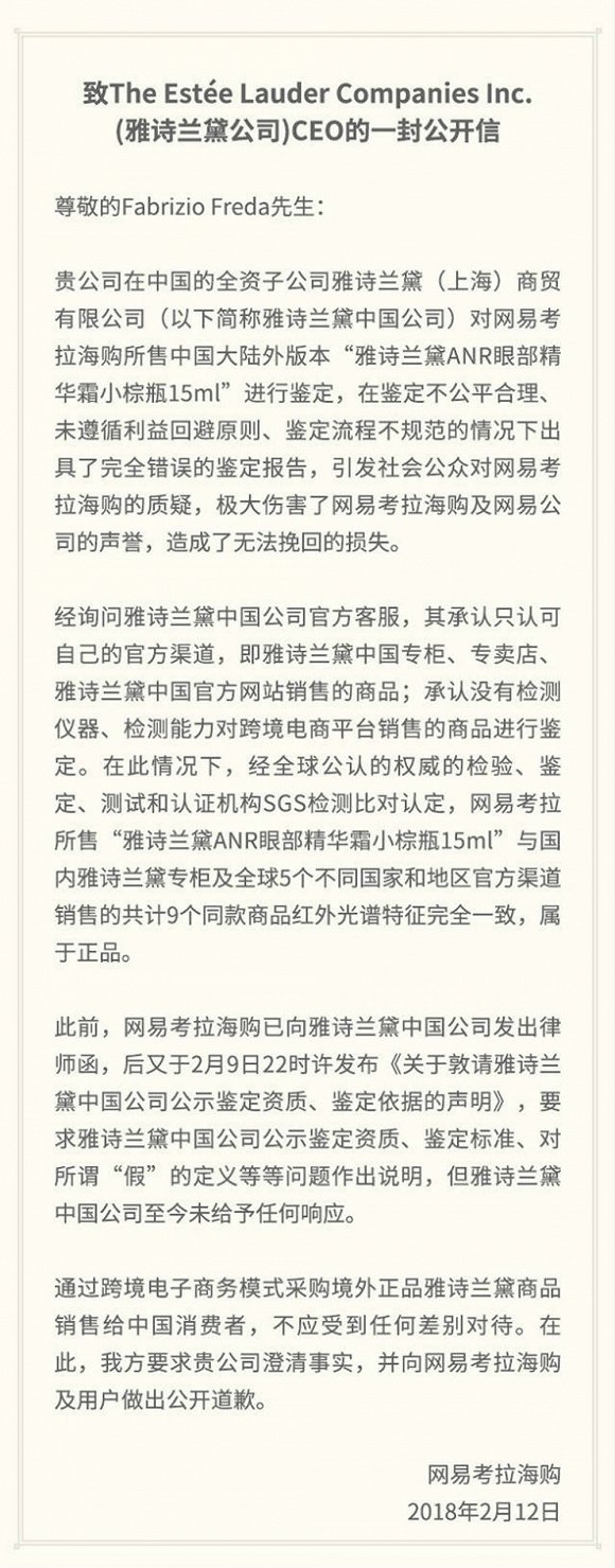 网易考拉致信雅诗兰黛环球CEO:请求澄清事实并致歉