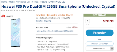 尽人皆知,华为P30、P30 Pro现在并没有在美国市场出售的设计,不外美国的消费者也有不少人照样愿望能够或许使用到华为P30、P30 Pro。对此,美国的海淘网站B&H日前已最先了资助本地消费者海淘预购华为P30、P30 Pro的效劳。