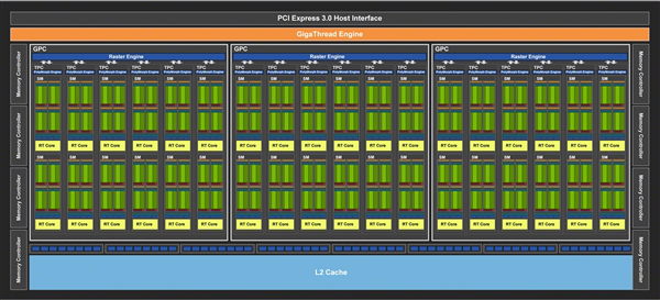 TU106 架构示意图:每一个 TPC 单位中一个 RT 中心 ( 黄色 )