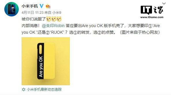 针对于 "ARE YOU OK" 定制手机壳,小米内部好像还没有一个明白的计划,是 "ARE YOU OK" 照样 "RUOK" 小米手机在微博中向网友讯问。不外,依照小米手机的说法,小米 9 的 "ARE YOU OK" 定制手机壳一定会推出,然则至于什么时候推出,小米手机并没有明白透露表现。上述的两套计划,小米设计师朱印好像更钟意第二个。