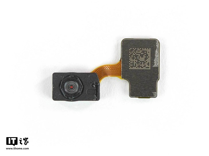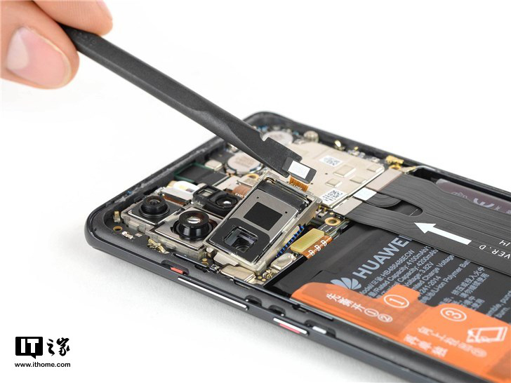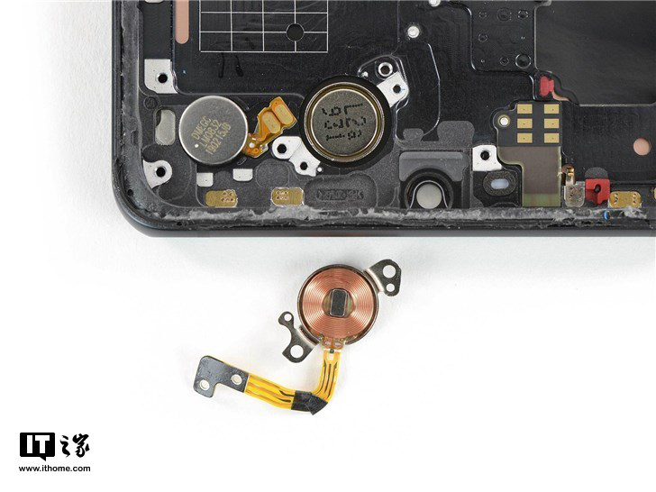 拆掉重要的排线后,华为 P30 Pro 的指纹传感器就漏出来了,这颗指纹传感器位于靠近手机底部边沿的地位。看起来很像摄像头。