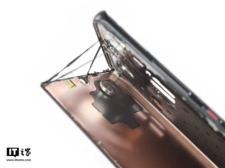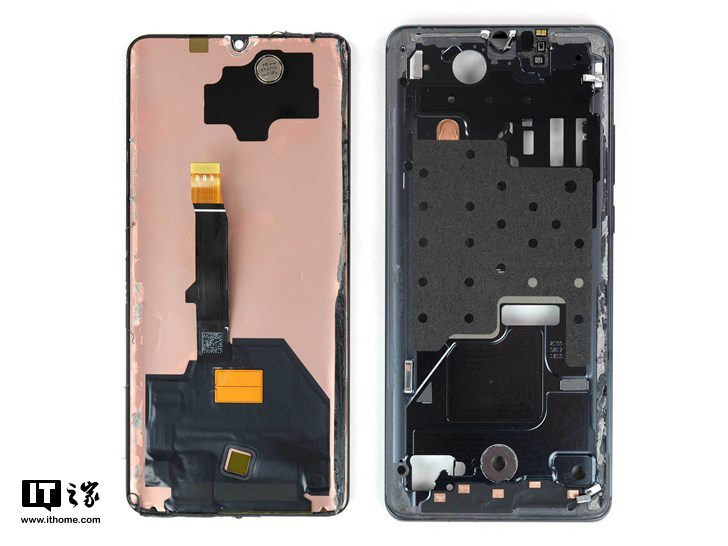 这里,我们看到,华为 P30 Pro 屏幕局部有大面积的散热铜片,同时在手机的框架上也有导热的贴。