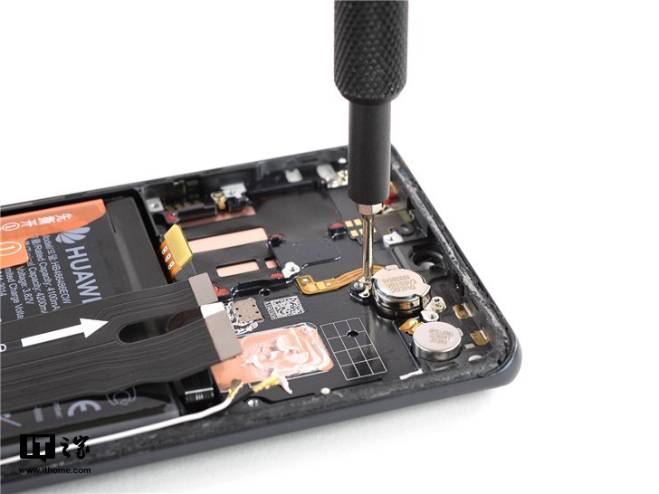 华为 P30 Pro 的磁悬发声模块经由过程两颗螺丝流动在金属框架上。