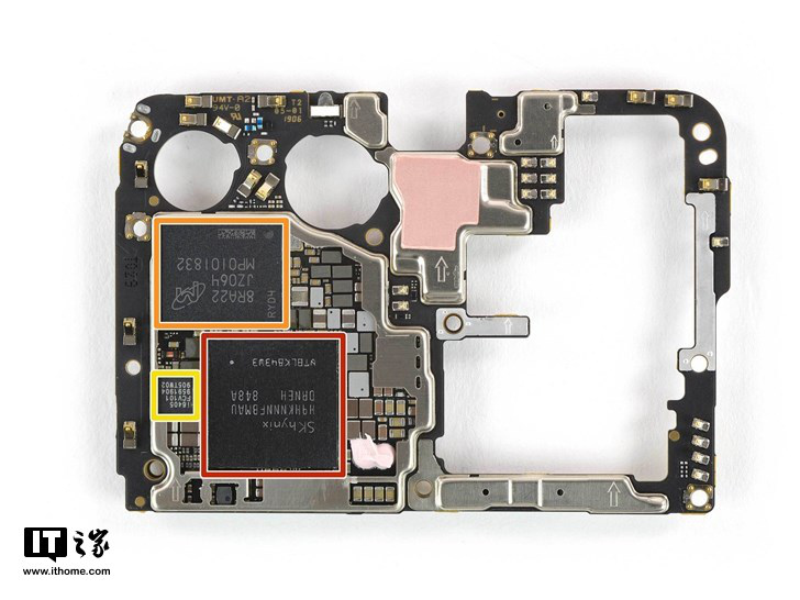 iFixit 将华为 P30 Pro 中心局部的珍爱片取下,出现在我们面前的赤色局部是 SK 海力士的 H9HKNNNFBMAU LPDDR4X 存储芯片,华为麒麟 980 处置惩罚器则位于这颗存储芯片底下。橙色局部是美光 JZ064 MTFC128GAOANAM-WT 128 GB 闪存,而黄色局部是海思 HI6405 音频芯片。