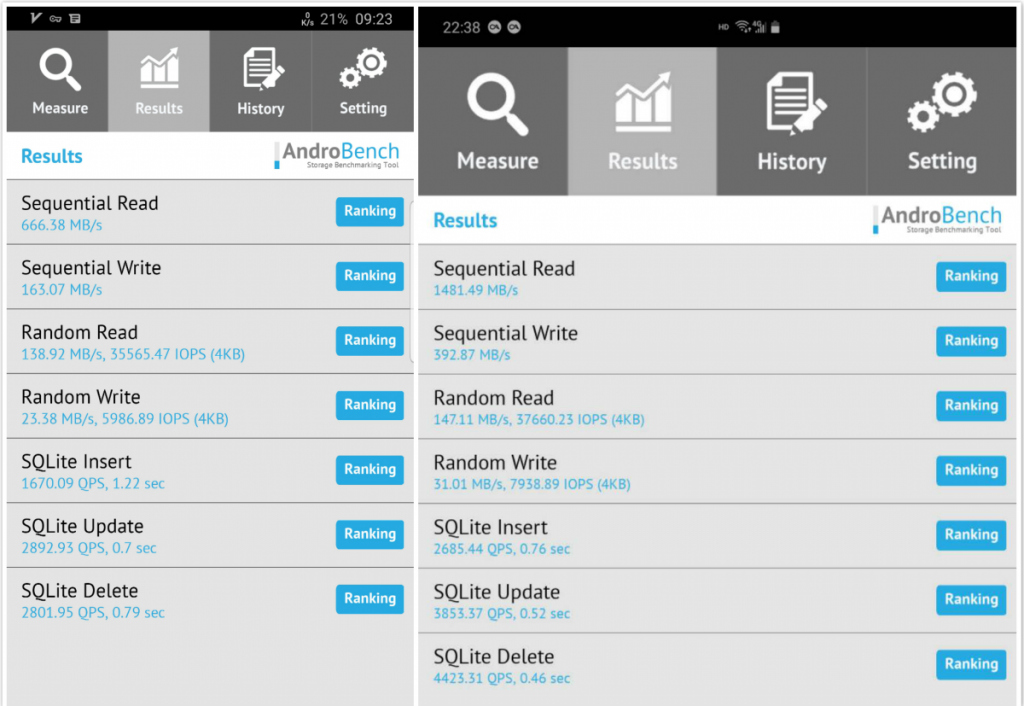 ▲ AndroBench 对照 Galaxy Note 9(UFS 2.1)和 Galaxy Fold(UFS 3.0)硬盘读写速率