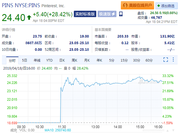 @新浪科技【Pinterest在美国纽交所上市,首日收盘较IPO上涨25%】Pinterest周四在美国纽交所上市,代码为PINS,首日收盘报23.75美圆,较IPO刊行价19美圆上涨25%。