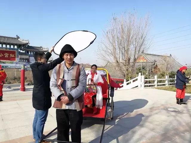 正在为费县红云小镇民风庙会做准备的上演职员和拍照协会成员。庙会请到当地快手红人直播助阵。(收集图源)