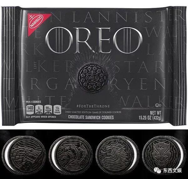 1)与奥利奥协作,推出限量版饼干。4月8日起,《权益的游戏》饼干在全美范围内限量供应。全部第八季,粉丝能够经由过程接见奥利奥网站、奥利奥的Facebook和Twitter频道,宣誓尽忠四大巨头中的某个。
