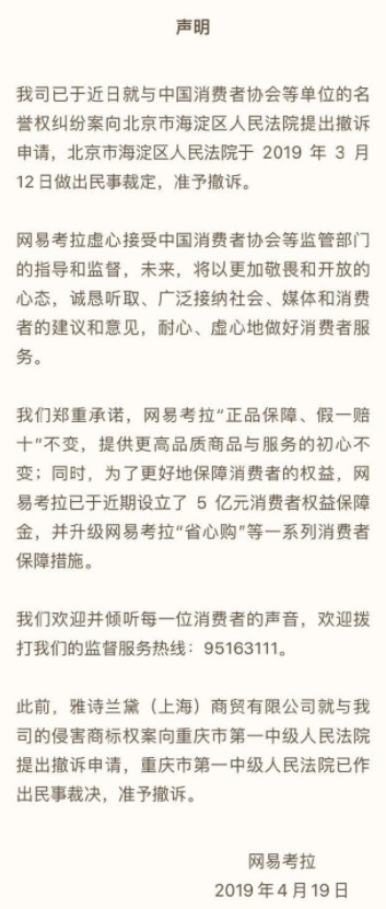 网易考拉在声明中称,公司已于近日就与中国消费者协会等单元等信用侵权纠葛案向北京市海淀区人民法院提出撤诉请求,北京市海淀区人民法院于2019年3月12日做出民事裁定,准予撤诉。同时,网易考拉泄漏表现,虚心接收中国消费者协会等监管部门的指点和监视,将来,将以越发畏敬和开放的心态,老实听取、普遍回收社会、媒体和消费者的建媾和一件,耐烦、虚心肠做好消费者效劳。在声明中,网易考拉还提到,除慎重许诺“正品保证、假一赔十”稳定,为了更好地保证消费者的权益,已于近期设立了5万元消费者权益保证金,并晋级网易考拉“费心购”等一系列消费者保证步伐,并附上了公司的监视效劳热线。声明中称,雅诗兰黛此前已就与网易考拉的损害商标权案提出撤诉并已获准。