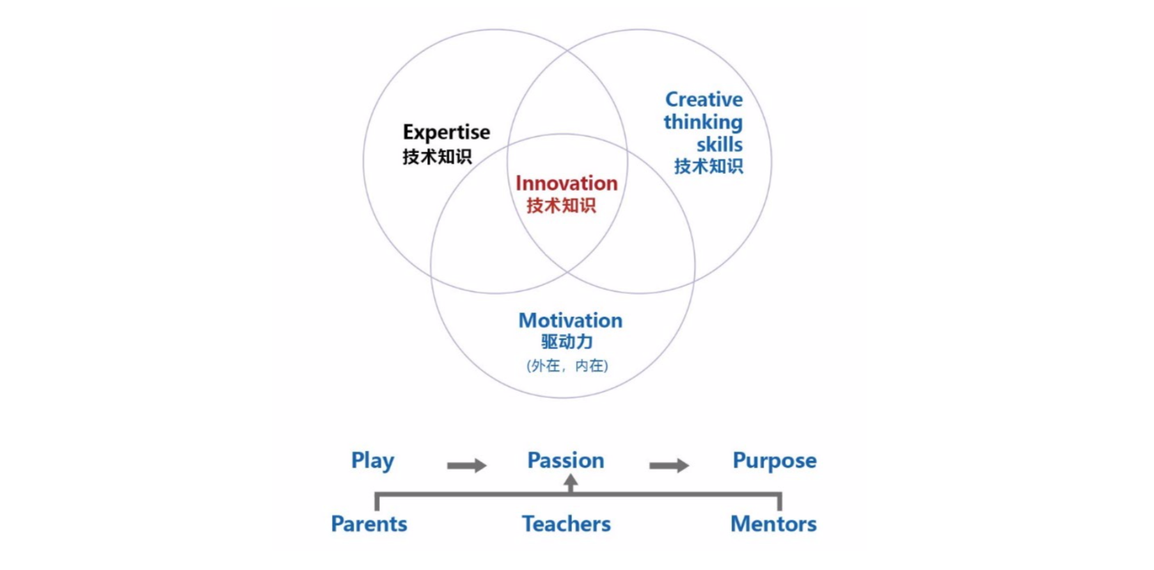 图 3: 立异的三要素:专业学问(比如 STEAM ),立异头脑和内涵驱动力, 而完成立异的途径是从 Play (玩乐)到 Passion (热情),再到 Purpose (义务)。父母、先生和导师 在这个历程当中的资助至关重要。