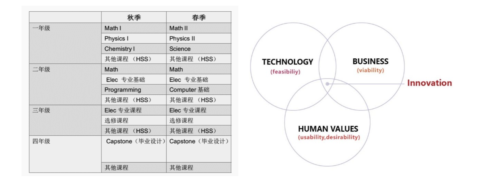 图 4 (a): 传统美国工科课程体系,每学期约莫 5 门课,40 门课程结业。 3(b): 科技立异三 要素:需求、手艺与商业情势