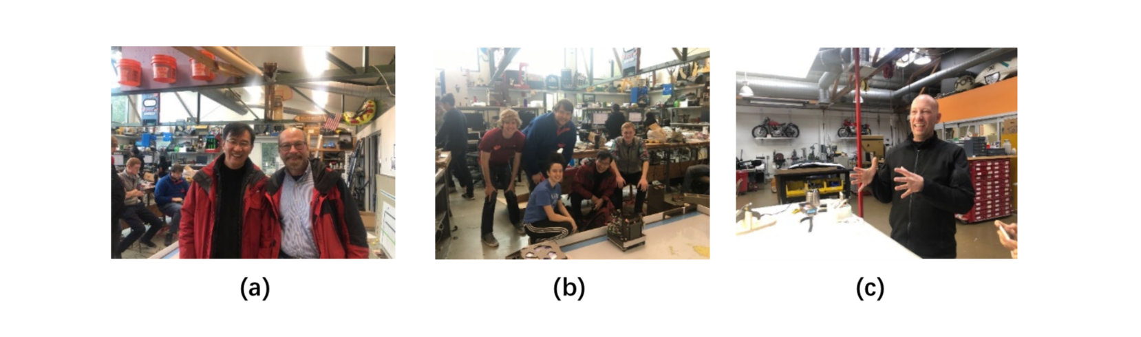 图 5: (a) 与 Ed Carryer 教授合影,(b) 与电机一体化项目制课程门生及他们的作品合影,(c) IDEO 合伙人 XX 与他的创客空间。