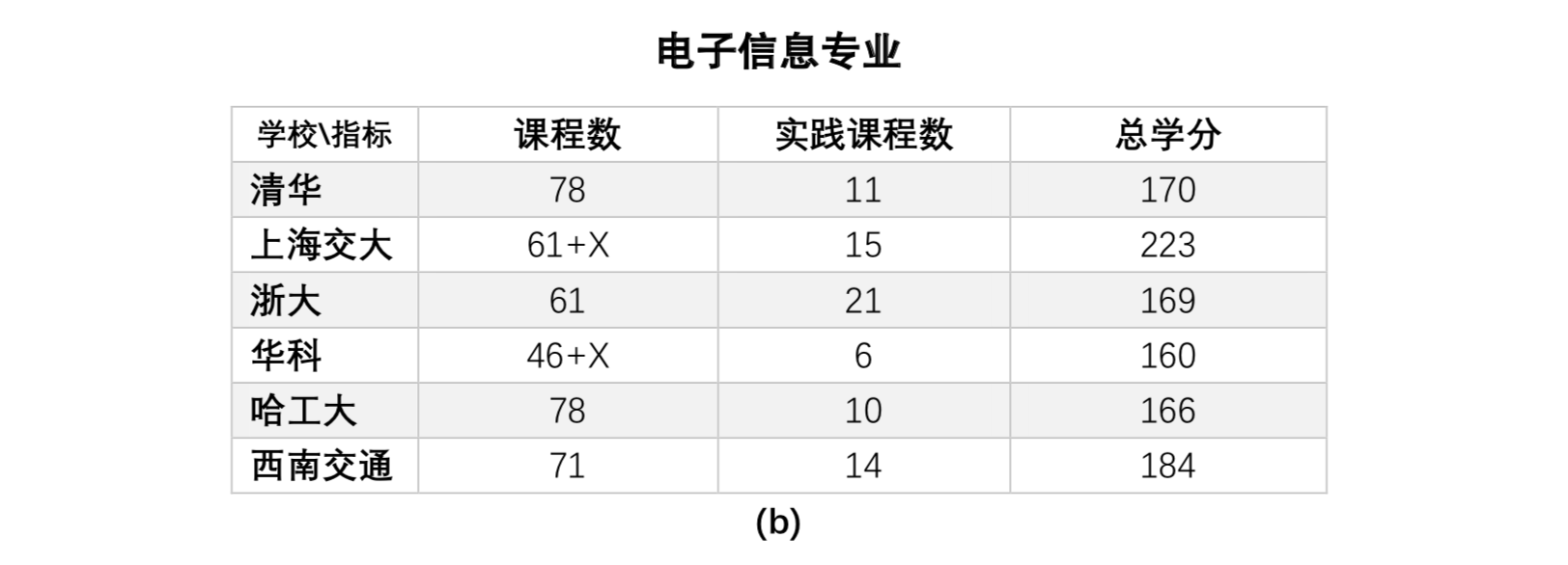 图 6. (a) 某内地高校第一学期的课程表。课程数远超 4 门、门生很少有自力思考、主动进修时候 . (b) 几所着名大学电子信息专业课程数量统计,远超 32 门课程。真正的项目制课程教授教养在此情况下是很难睁开的、不论门生何等优异。