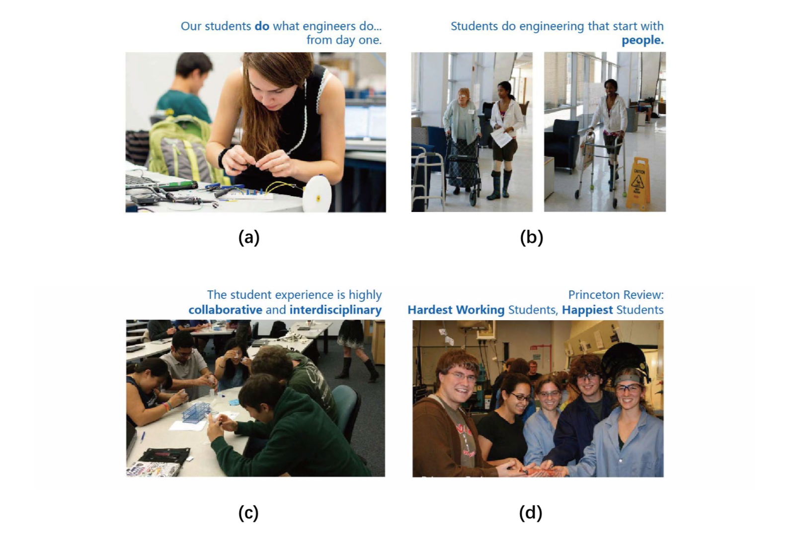 图 7. Olin 课程的几个特性。(a). 第一天就经由过程项目打仗工程, (b) 以人为本的设想课程,(c) 跨学科融会课程, (d) 辛劳但快活的门生群体。