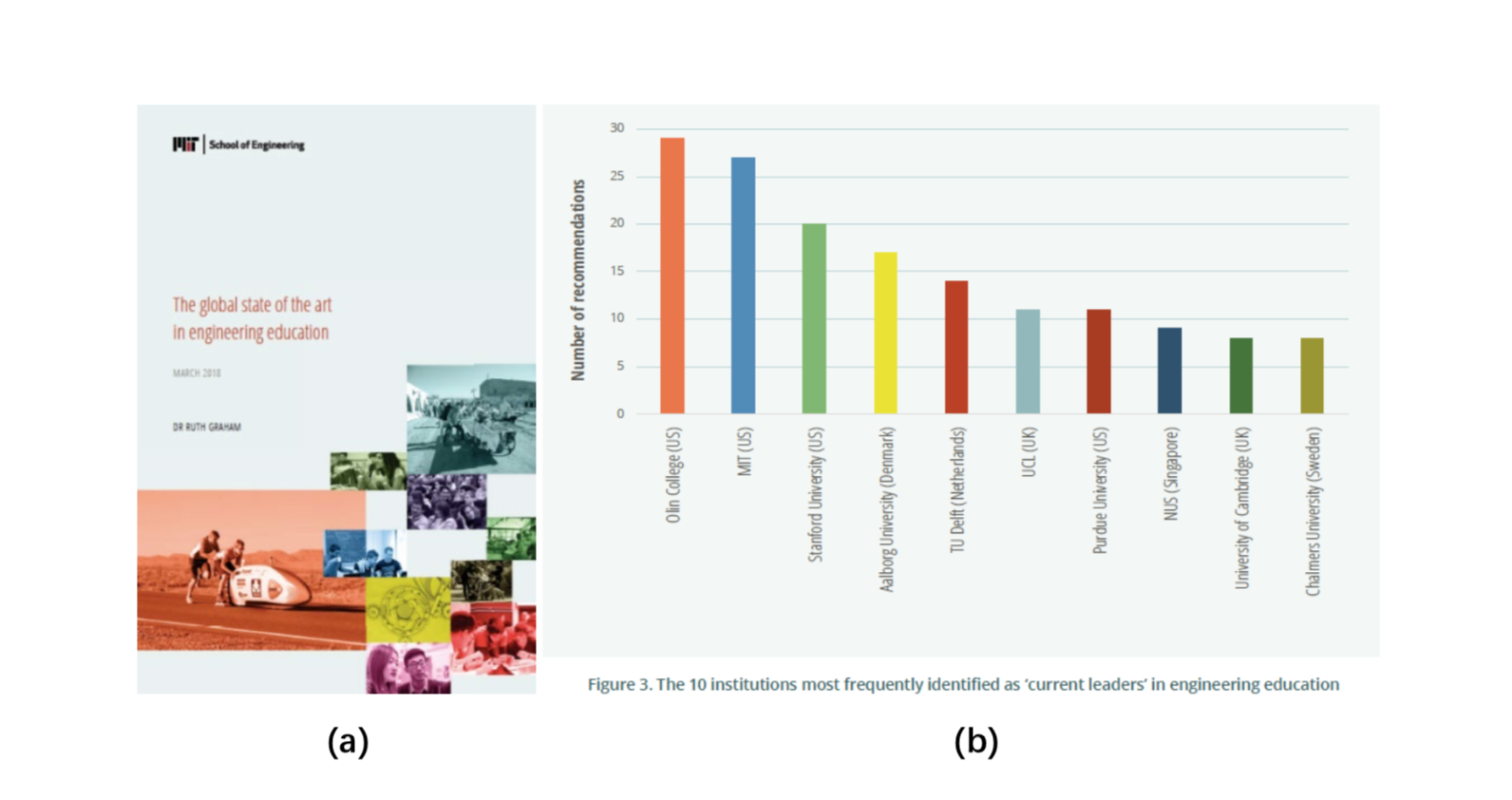 图8:(a) 受MIT托付、由高级工程教诲征询专家 RuthGraham 宣布的征询申报。(b) 来自环球的工程教诲专家一致公认 Olin 是环球工程教诲首脑,逾越了 MIT,Stanford 等名校。