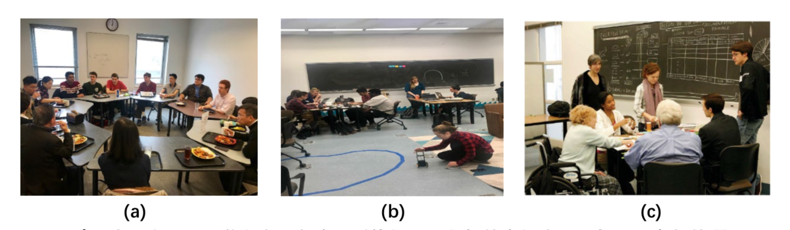 图 9. (a) 与一组 Olin 门生雷同交换、听他们笑逐颜开的引见小我兴致和介入的项目、 对其团队协作精力印象深入。(b). 门生 在 QEA 课程经由过程到立小车来进修掌握道理场景,(c). 师生课堂议论一景。