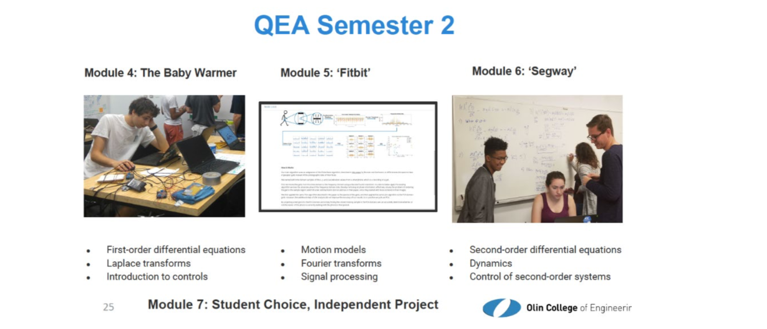 第三个课程特性是多学科融会和团队协作精力造就。很多课程经由过程项目载体、把多学科学问奇妙融会起来。再经由过程着手试验、启发式进修、翻转课堂、失利剖析等要领让门生学会怎样融会与运用多学科学问。一年级第二学期和二年级第一学期, 门生必修的两门课程 Quantitative Engineering Analysis (QEA,相当于 4 门课) 就 是一个极好例子。QEAI 的第一个模块 (Module),门生须要设想一艘知足某些请求的船,并使之能浮起来。先生并没有通知怎样做。经由短暂的疑心后,门生决议着手试。自身查材料与专利。器械做出来后门生最先做试验,但基本都失利了。先生这才启发门生须要竖立一个模子,而且用 Matlab 仿真软件去剖析和优化设想。为此,门生须要进修力学去竖立数学模子,再用多元微积分去剖析船的机能,线性代数和 Matlab 仿真软件去优化设想参数。优化后,大局部小组的设想都能浮起来,但仍有局部达不到请求。先生随后把人人聚在一起,剖析为何达不到请求和怎样去革新。这个模块把局部力学学问、多元微积分学问、线性代数学问和仿真软件的运用融会起来,再加以机器设想与制造,从失利中进修。团队协作, 特别是在阅历屡次失利后胜利的造诣感、表达雷同才能都获得很好磨炼。第二个模块是设想与开辟一小我脸设别软件。这个模块须要融会线性代数里的 eigenfunction, linear regression, principal component analysis (PCA) 等学问和编程技能。第三个模块是设想一款巡线机器人。门生须要融会和运用微积分的参数曲线表达、梯度算法、 动力学和坐标变更等学问、来制造并调试胜利一个巡线机器人。QEA II 包孕一个婴儿保温器、一个可穿着装备,一个均衡车和一个自选问题。每一个模块须要进修的学问见图 10. 经由过程 QEA 课程的 7 个模块,门生掌握了多元微积分、线性代数、微分方程、工程数学、力学、反应掌握等几门数理与工程基本课程等融会与运用。并在此历程当中学会了很多职业妙技。图 11 是一门融会材料与化学等的项目课程引见。 图 12 展现了课程交织融会的结构图。初期以数学、科学与中心工程课程的融会和设想课程与工程和 AHS 课程的融会为主。 背面经由过程结业设想课程把一切前面所 学与企业和市场需求融会起来,门生学会实战履历。