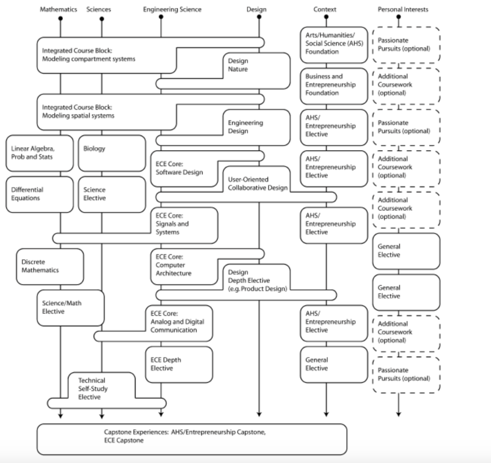 图 12: Olin 的课程体系框架。 初期把数学与科学和工程融会起来, 设想与工程和HAS 课程融会起来。 Capstone (SCOPE) 课程把前面所学与企业需求和市场需求融会起来。