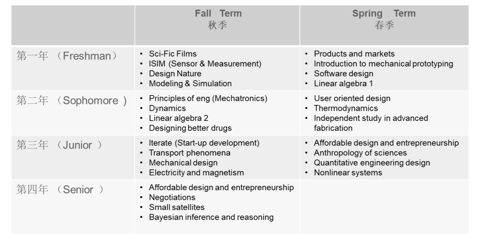 别的,第四个课程特性则是设想课程(从人到人或许是以人为本的设想课程 ),专注设想头脑练习与工程完成相结合的设想课程起码有 5 门,占到课程总数的 20%或 者更多 (结业设想课程相当于4门课程)。 课外运动课程比如种种竞赛也包罗设想头脑练习。第一学期的 Design Nature (设想导论), 第二学年的 Principles of Engineering,User-orientedCollaborativeDesign, 第三学年的 DesignDepth, 和 第四学年的结业设想SCOPE。