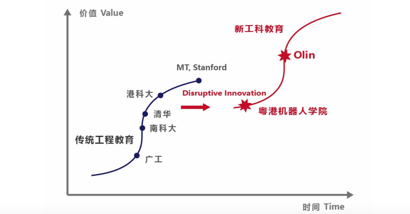 图 18: 左侧的曲线代表传统的教诲情势给门生制造的代价。 处于巅峰的 MIT,Stanford, 和 Berkeley 等名校也在探究怎样去打破传统曲线的极限。右侧的曲线是 Olin 代表的新工科教诲,高级教诲六十年后一个推翻式的立异涌现了!