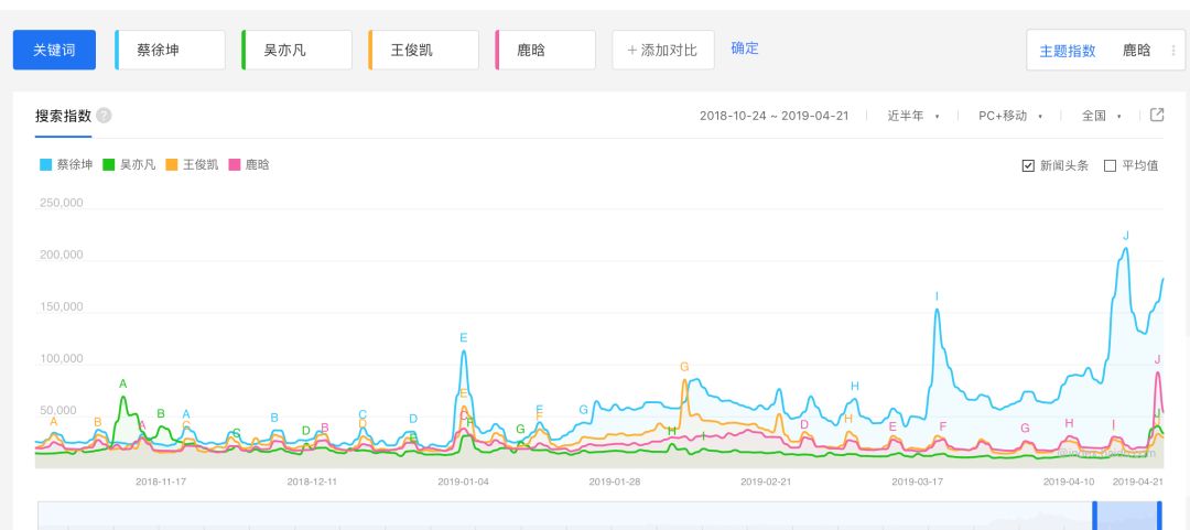 若是我把蔡徐坤、吴亦凡、鹿晗、王俊凯四位流量小生一同拉进来对照,状况就更显着了。2019年1月今后,从大趋势来看,吴亦凡在这四个人中心以至长时候是垫底的。