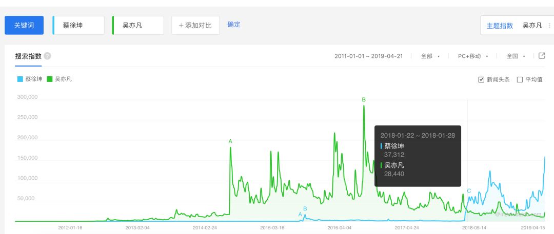 若是我们再去看吴亦凡和蔡徐坤出道以来的热度,对照后更能发明题目。