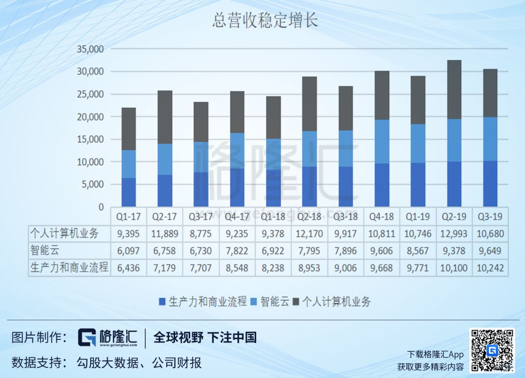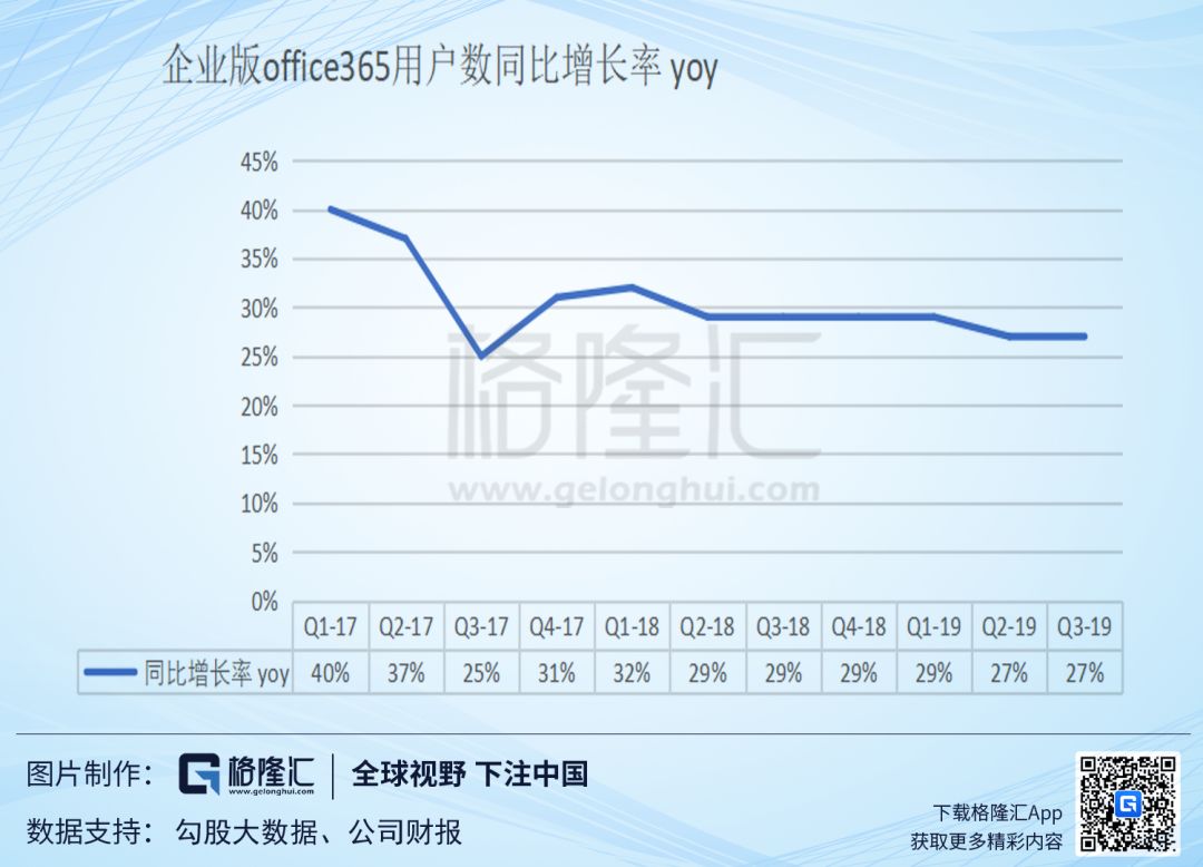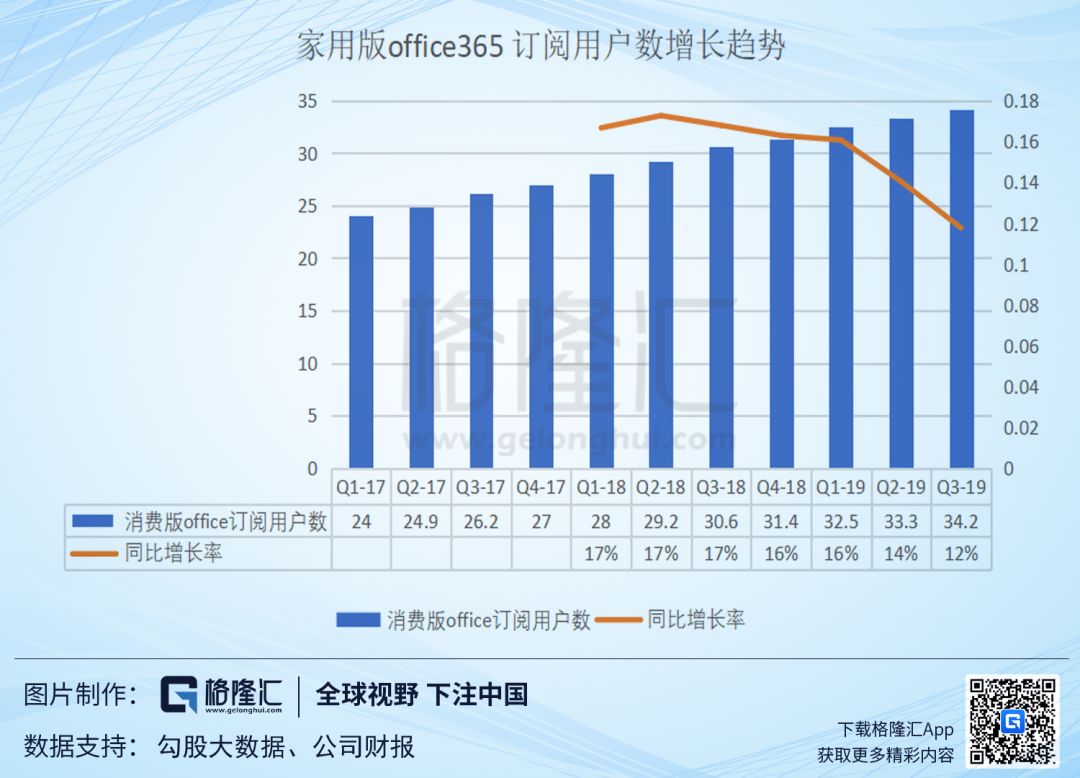 Office365的形式获得了大部分企业和消费者的承认。企业版Office365的用户数在曩昔11个季度的同比增速一向连结在25%以上。家用版office365定阅用户数也以12%以上的同比增速在增进,用户数在Q3到到达3420万人。