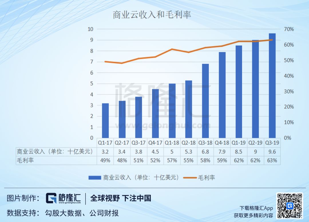在微软三大块营业中,智能云部分并不能展现微软一切云营业的真实状况。以是微软把一切触及云的营业划分到一个叫“贸易云”的目标中,并在每一个季度宣告贸易云营业的收入和毛利率。Q3贸易云收入为96亿美圆,同比增进41%,一切放缓。但在之前四个季度中,贸易云收入一向以70%以上的同比速率增进。云营业的毛利率也从17年Q1的49%上涨到19年Q2的62%,并稳固在60%以上。