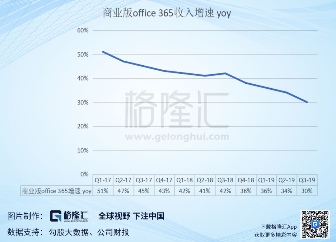 纳德拉曾在2018年终说到,Office 365的增进时机比他开辟过的任何产物的增进时机都要大。贸易版office365季度收入在曩昔十个季度增进速率有所放缓,这跟范围增大有关,但季度收入同比增进速率依然连结在30%以上。