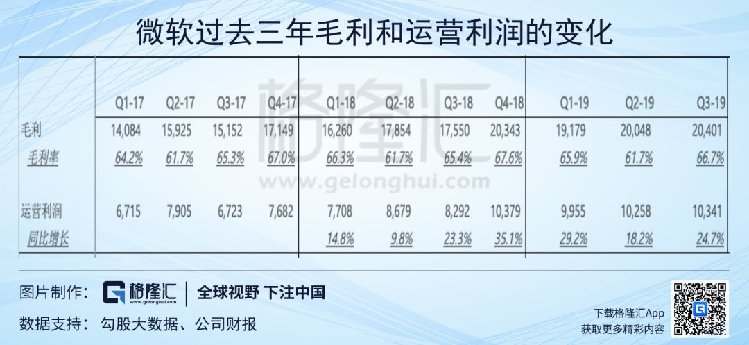 除主营营业收入稳固增进,微软的红利才能赓续在加强,体如今毛利率在进步,运营利润和净利润的增速高于营收增增速。Q3运营利润为103亿美圆,同比增进25%;净利润为88.1亿美圆,同比增进19%。毛利率从上年同期的65.4%上升到66.7%。