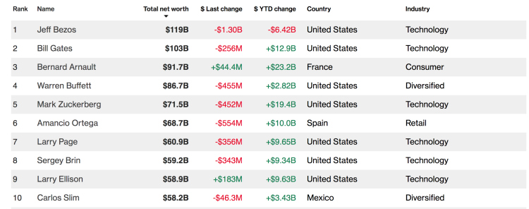 自 2017 年中至今,亚马逊股价险些增进了一倍,这也稳固了贝索斯天下首富的职位。法国奢侈品 LVMH 团体总裁 Bernard Arnault 在往年 3 月逾越股神巴菲特,登上了富豪榜第三名的职位。