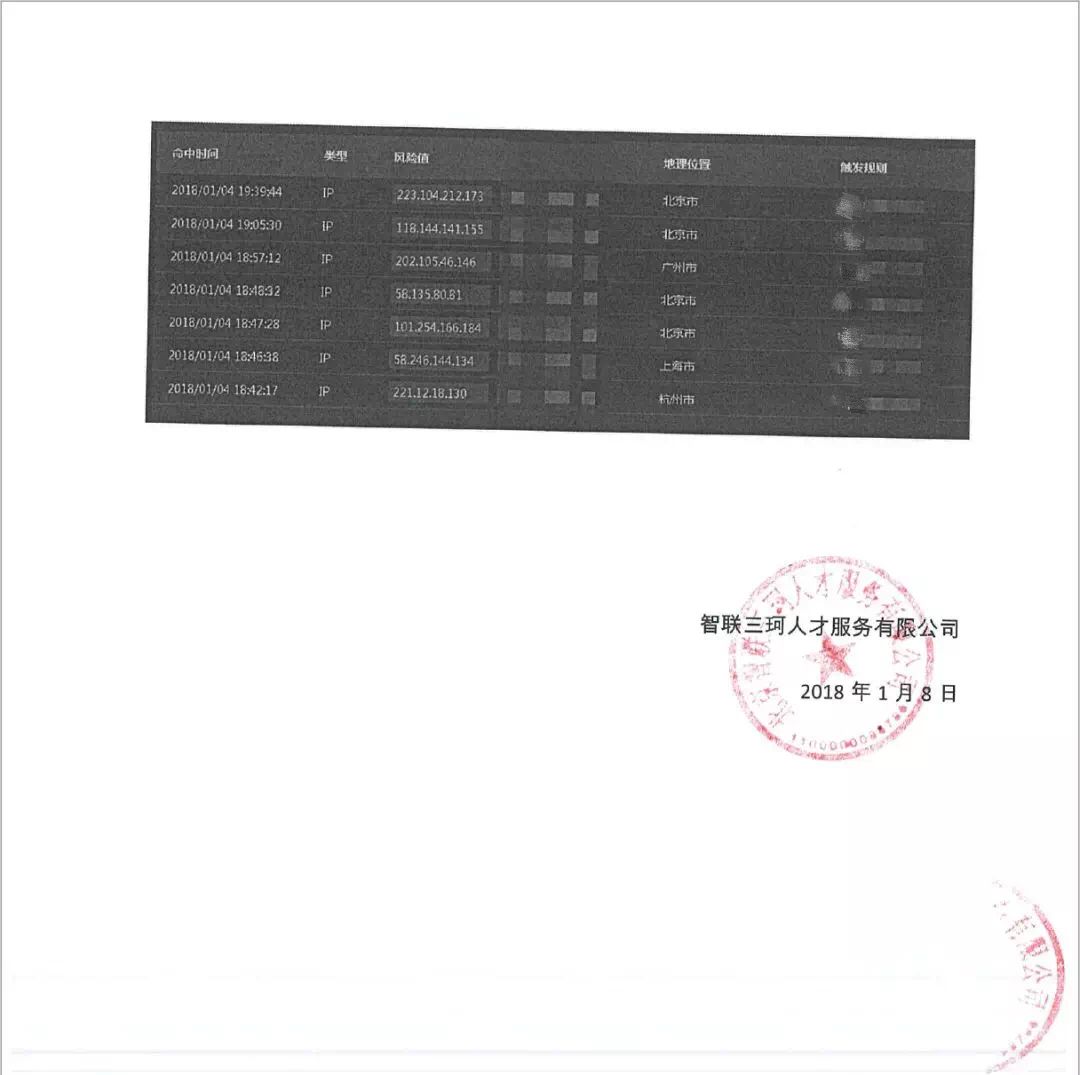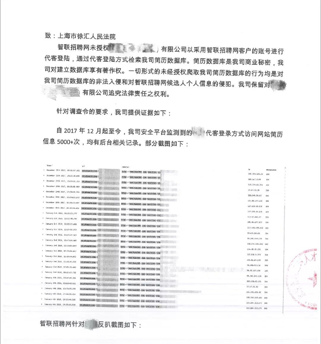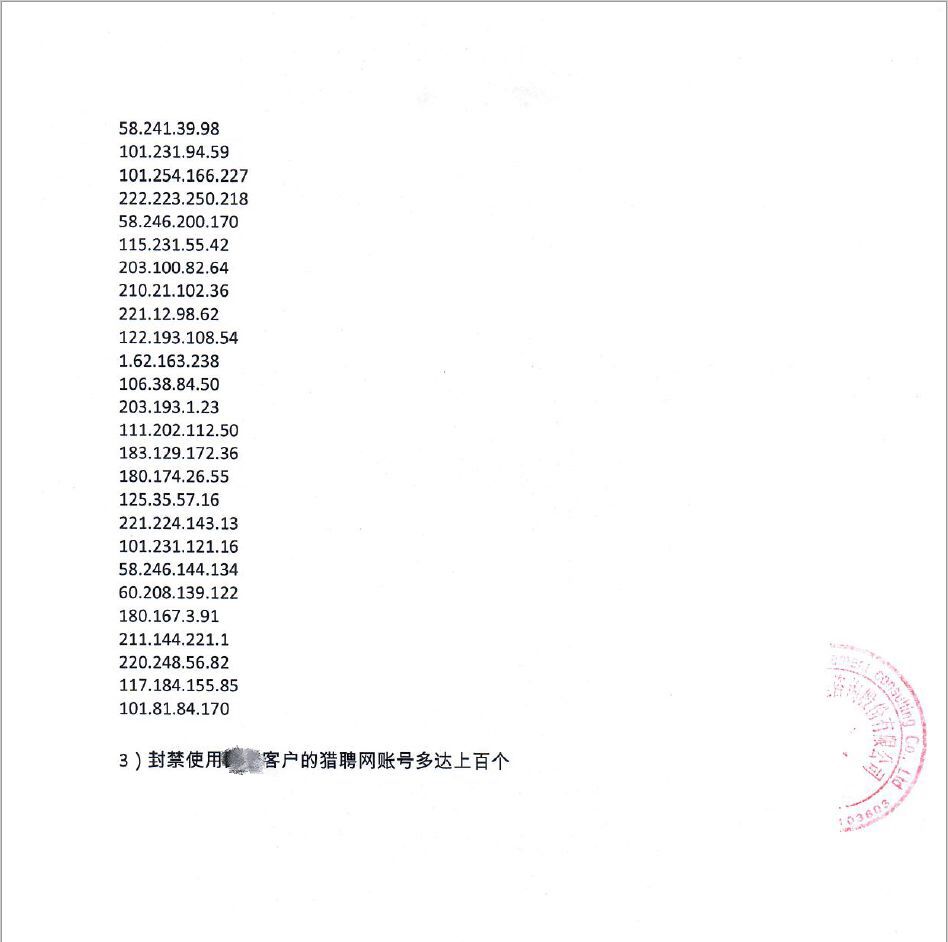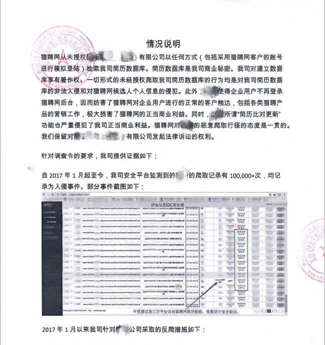该案审理期间,智联招聘和猎聘网的说明坐实了戴顺的推断。两家招聘平台都向法院出具了T公司的数据爬取记录,并表示保留对T公司追究法律责任的权利。