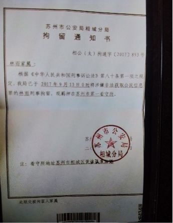 留给林雨家属的林雨拘留通知书