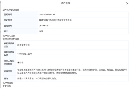 4月7日消息,据天眼查数据显示,日前,瑞幸咖啡(中国)有限公司新增一条动产抵押信息。抵押权人为中关村科技租赁有限公司,被担保债权数额为4500万元。据媒体报道,此次抵押范围包括但不限于标号为KJZLA2019-089融资租赁合同项下租金和逾期利息、租赁物回购款、违约金、赔偿金、其他应付款项以及出租人为实现债权而支付的诉讼费用、律师代理费和其他费用。