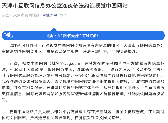 @天津网信【天津市网信办连夜约谈视觉中国,责令周全完全整改】4月11日,针对视觉中国网站流传违法有害信息的状况,天津市互联网信息办公室依法约谈网站负责人,责令该网站立时住手违法违规行为,周全完全整改。