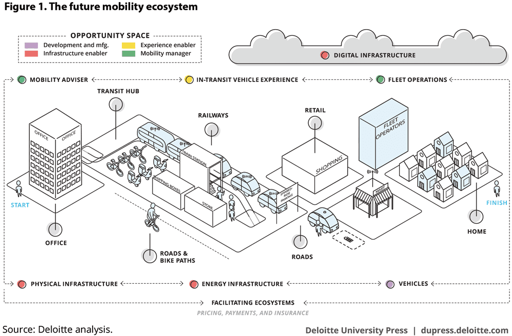 上图是德勤研讨团队绘制的将来的挪动出行生态图景,该生态最少包罗以下四局部: