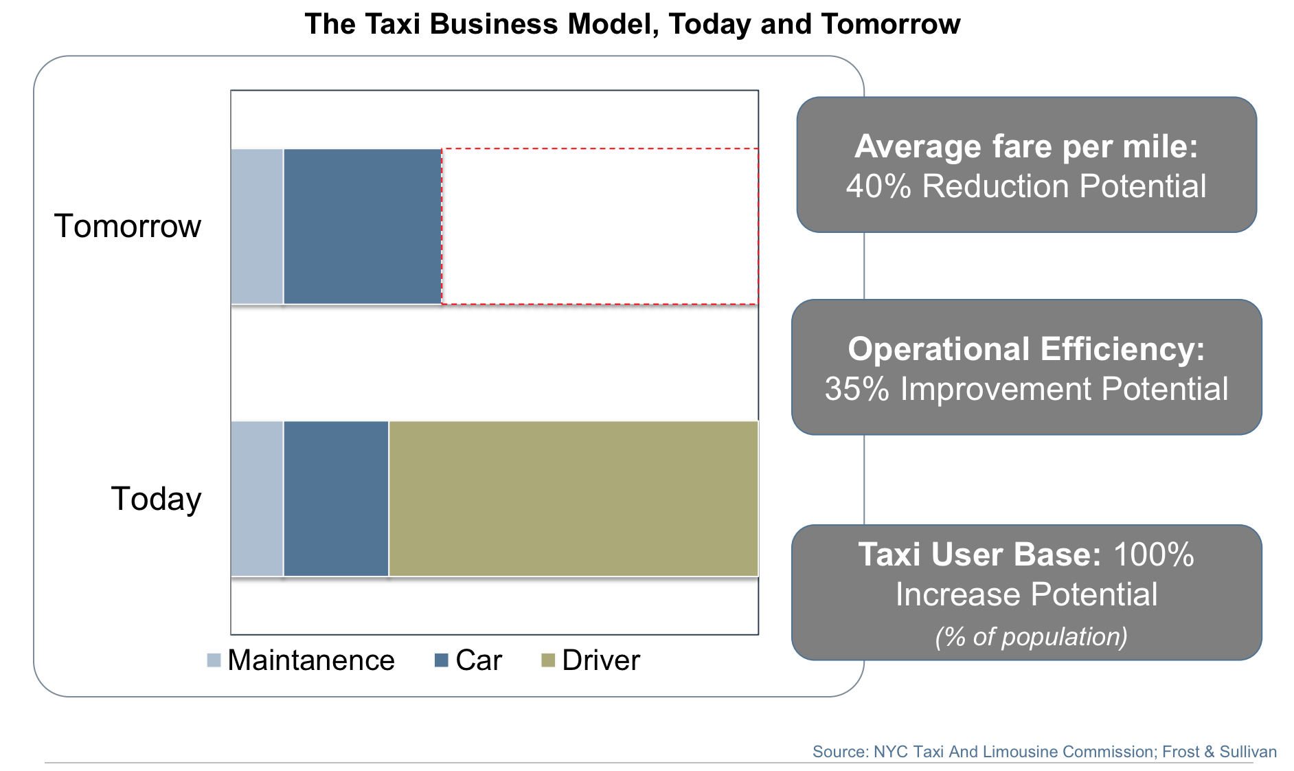 上图是对出租车做个简朴的本钱拆解。能够看出,维修养护、车辆本身和驾驶本钱是眼下一切车辆没法逃避的。而比例最大的一块,恰好存在不小的可优化空间。