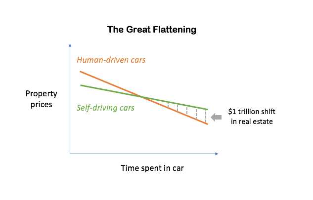 能够如许明白,无人驾驶手艺会逐步抹平由于地舆间隔而发生的房产价钱差别,下图中红绿线段之间的局部,即为无人驾驶手艺在房地产行业所形成的代价转移。