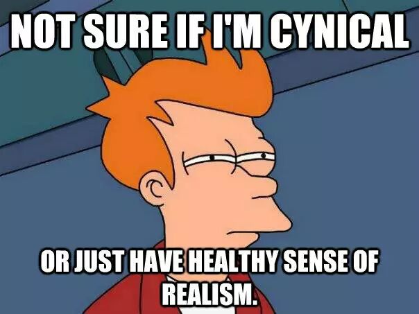 追随实在,这也使得烦闷实际主义与犬儒主义区分开来。在犬儒主义那边,既然人没法肯定甚么是实在,那末追随实在也就没有意义,这也就致使了完全的虚无主义。烦闷实际主义不接收这类虚假主义。比方,一个烦闷实际主义者因为痛感世道的阴郁,发出对政治和政客的无望悲呼:“天下乌鸦一样平常黑。”这个对实际的意见比起“大多数官员是好的”也许“九个指头与一个指头的干系”这类乐观的意见,应当是越发靠近实在和实际。“天下乌鸦一样平常黑。”也常常是犬儒主义的说法。烦闷实际主义这么说,是认为当官的可以也许不像,也不应当像乌鸦,只需他们不像乌鸦,就可以也许有不贪不腐的官员。犬儒主义这么说,是认为,当官的不能够不像乌鸦,期待当官的不贪不腐,那是在白日做梦。