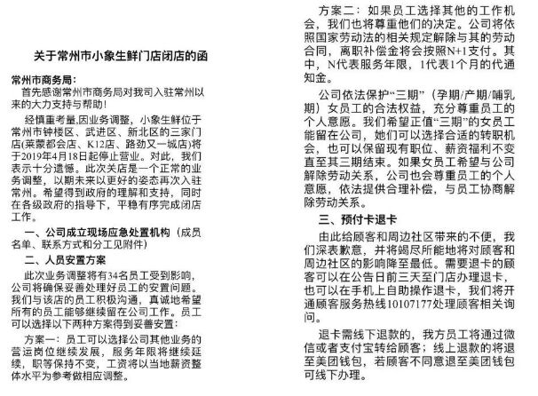 依据小象生鲜致常州市商务局的信件中说起,此次关店属一般营业调解,将触及34名员工受到影响,关于员工安装及预付卡退卡,也给出了响应解决方案以下: