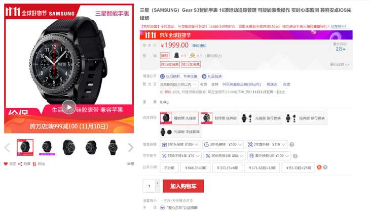 三星Gear S3 前锋版 京东 售价 1999元 >> 购置链接